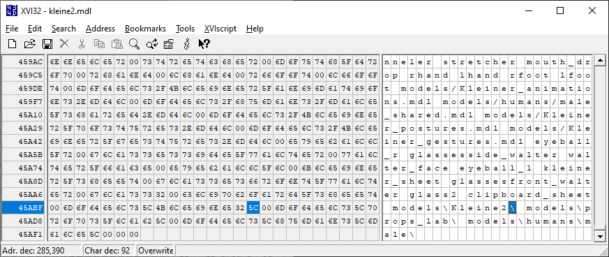 Hexing is a very old technique for creating independent copies of Source models. Its name derives from its using a hex editor to modify the target model files, which are binary formats that cannot be easily edited with a text editor like Notepad.