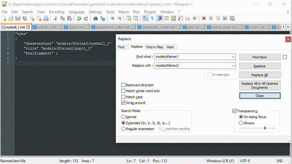 7.) Use Ctrl-H to bring up Find and Replace. Find the old material path, and replace it with the new material path. Replace All in All Opened Documents. Then use Ctrl-Shift-S to save all open files.