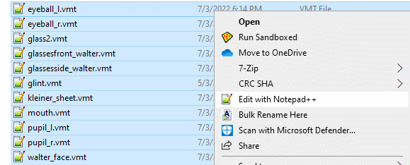 6.) Open the newly renamed material paths. Sort the folder by Type. Select all of the VMTs, right-click, and choose Edit With Notepad++.