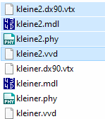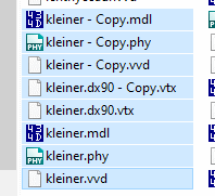 1.) Find all model files sharing the name of the model you wish to hex. Make a copy of them all. For this example, we will hex kleiner.
