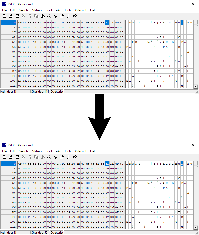 3.) Open the newly-renamed .MDL file in XVI32. At the very top of the file, you see the old model name. Make the same exact name-change as you did to the file. The filename must exactly match the name you change it to in XVI32.